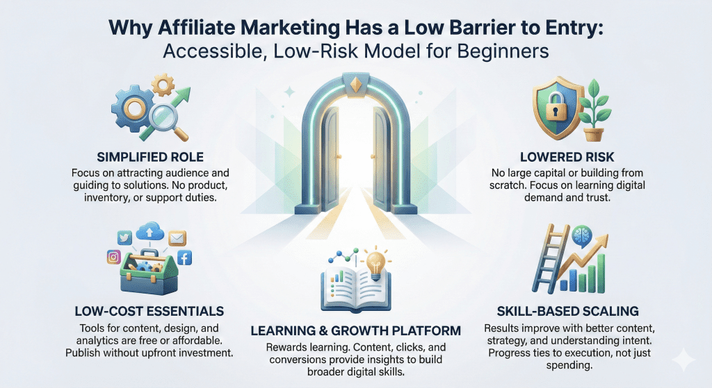 Affiliate marketing stands out because it allows beginners to participate in a real business model without taking on the most expensive or complex responsibilities first.
