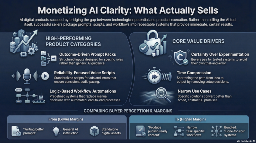 What sells in this category is not innovation, but interpretation. Products that package clear thinking into usable formats allow buyers to move faster with fewer decisions. This is why narrowly defined prompt packs, voice scripts, and workflow systems outperform broad or abstract AI offerings.