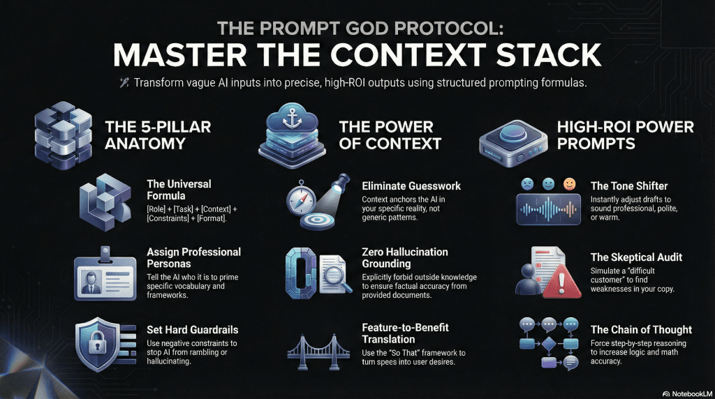This is where most prompts fail. You must give the AI the “Context Stack” the background info it needs to make decisions. The more you feed it, the sharper the output.