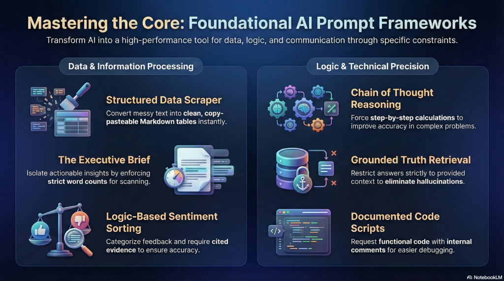 These prompts cover the essential capabilities of modern LLMs. Whether you’re analyzing data, coding, or summarizing long reports, these foundational examples are designed to be precise, adaptable, and most importantly reliable.
