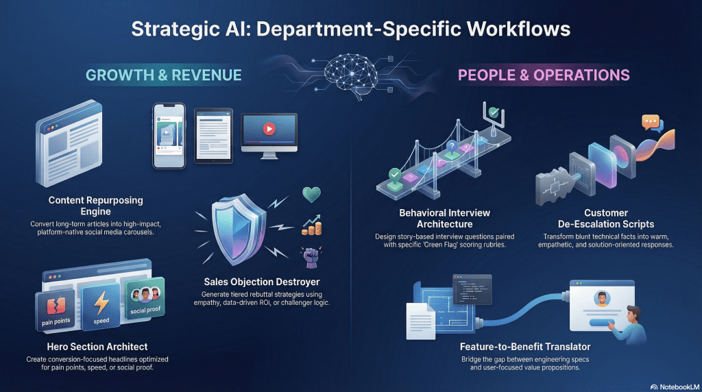 AI isn’t just a general-purpose assistant; it becomes exponentially more valuable when you tailor it to specific departmental KPIs. The following examples move beyond simple drafting and into strategic problem solving.