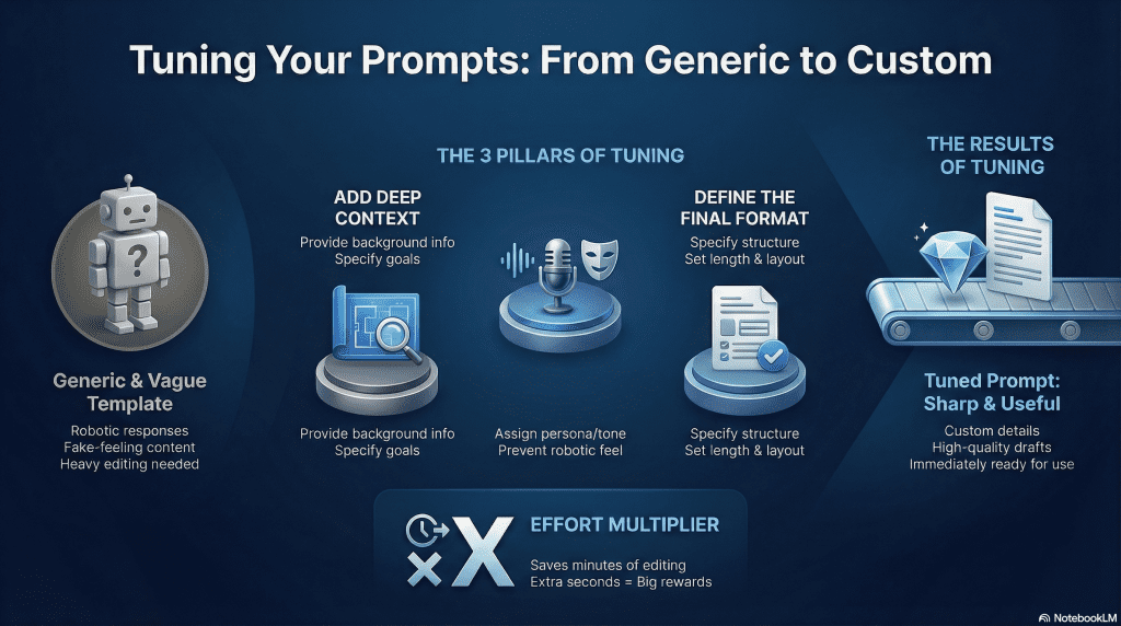 Templates are good starting points. They save time. But they are often too general. A template does not know your specific job, your style, or your goal. To get the best results, you must change the template to fit your needs. We call this “tuning.”