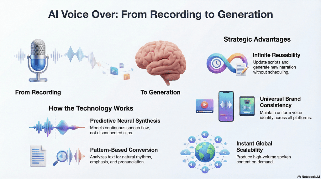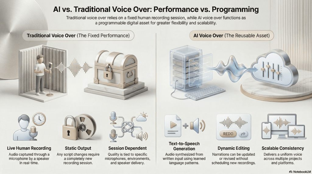 - Unlike traditional voice over, AI voice allows narration to be generated, updated, and reused without new recording sessions.