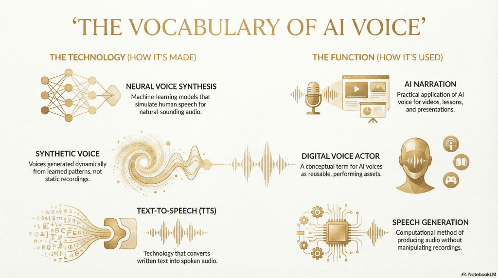 AI narration emphasizes how the voice is used rather than how it is created. It refers to AI-generated speech applied to narration tasks such as videos, lessons, or presentations.