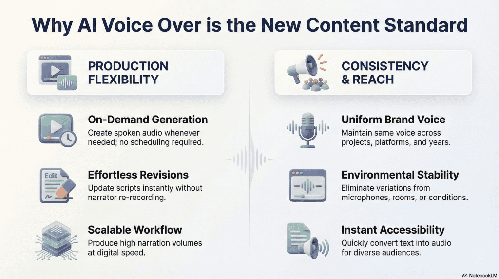 AI voice over has become widely used because it changes how spoken audio can be created and maintained over time. Instead of treating narration as a fixed recording, AI systems allow voice to be generated whenever it is needed, making updates and revisions easier to manage. This flexibility is especially useful in environments where content changes frequently or must be produced at scale.