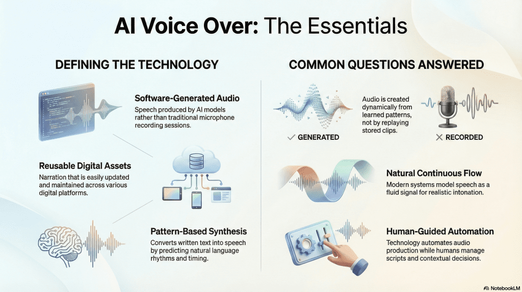 AI voice over is best understood as a way of generating spoken audio through software rather than recording a human performance.