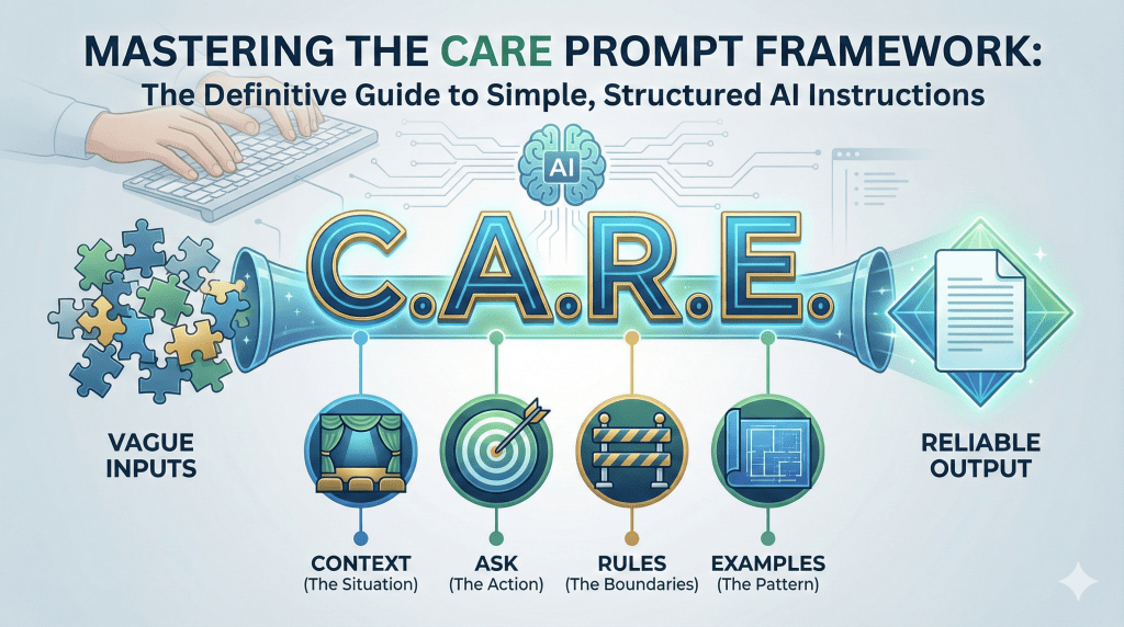 CARE stands for Context, Ask, Rules, and Examples. It’s a prompt framework designed to help you give AI clearer, more complete instructions so the output is accurate, relevant, and easier to use.