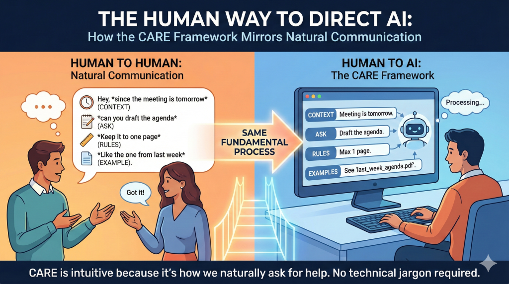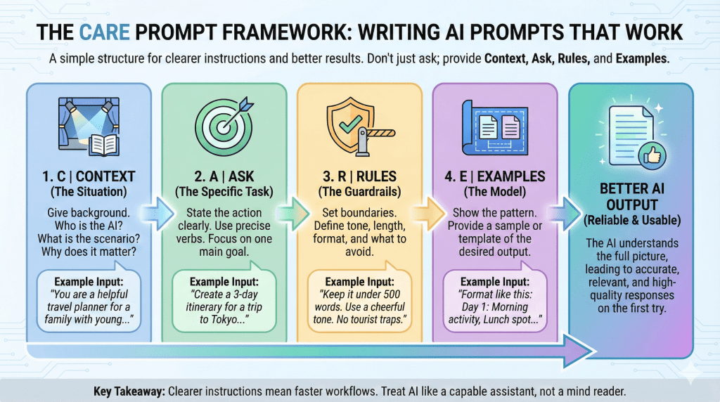 You don’t need to write out “Context,” “Ask,” “Rules,” and “Examples” every time you use AI. Instead, think of CARE as a quick mental checklist. Before you hit enter, ask yourself whether the AI has enough information to understand the situation, the task, and the boundaries.