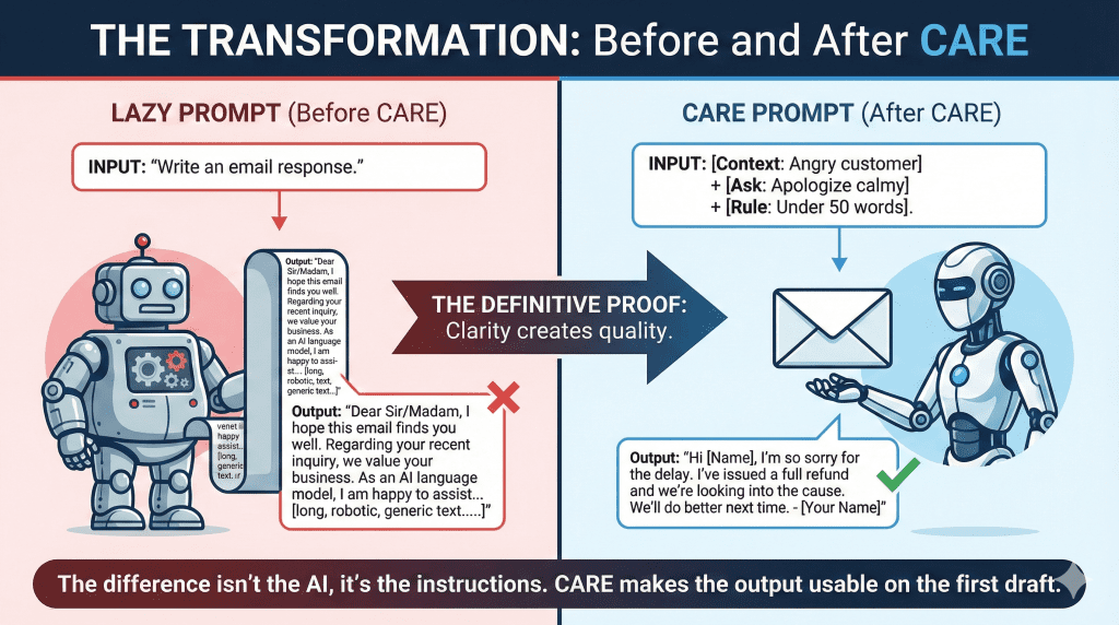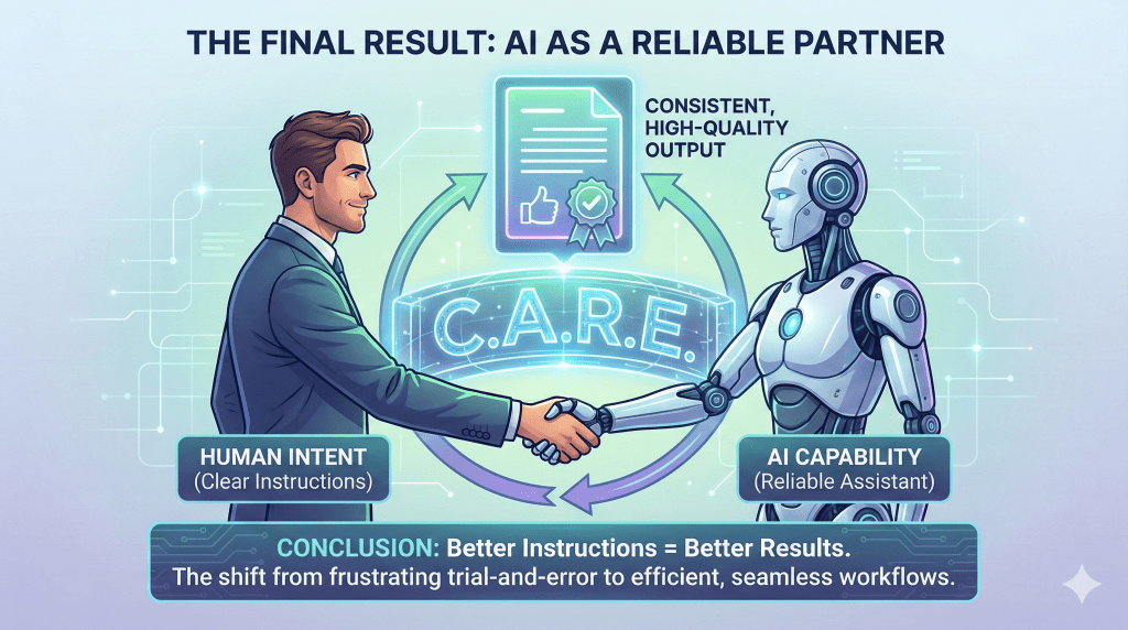 The goal of the CARE framework isn’t to make prompts longer or more complicated. It’s to reduce the time you spend fixing AI output after the fact.