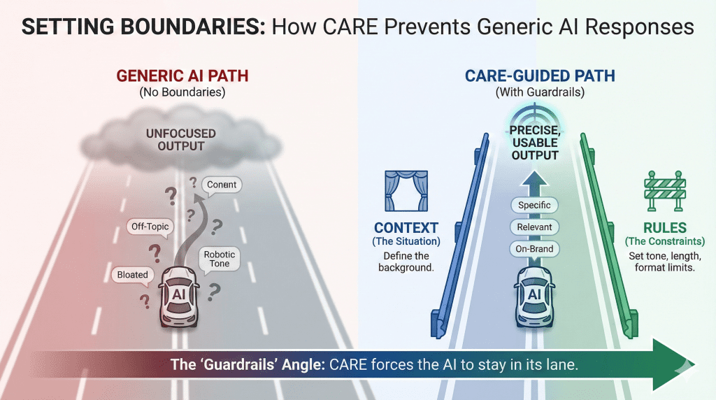 CARE stands for Context, Ask, Rules, and Examples. It’s a simple, human way to structure prompts so the AI understands the situation, the task, and the boundaries before it starts generating anything. No technical jargon. No overengineering. Just clearer instructions that lead to better results.