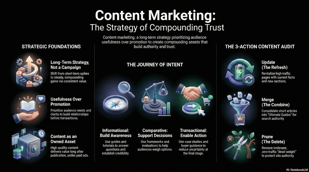 Content marketing is a strategic approach to publishing that focuses on helping an audience understand, decide, or act more confidently over time. Its purpose is to create value through information and insight, not to interrupt or persuade aggressively. When done correctly, it builds a relationship with the audience before asking for attention, trust, or action.