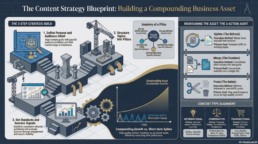 Building a content marketing strategy is about making deliberate choices before content is created. The goal is to ensure every piece of content serves a clear purpose and contributes to a larger system rather than existing in isolation.