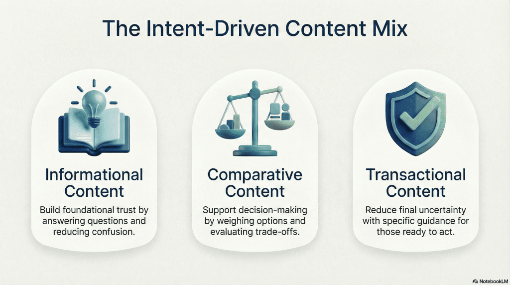 Effective content types depend on intent. Informational content builds understanding, comparative content supports evaluation, and decision-support content helps audiences act with confidence.