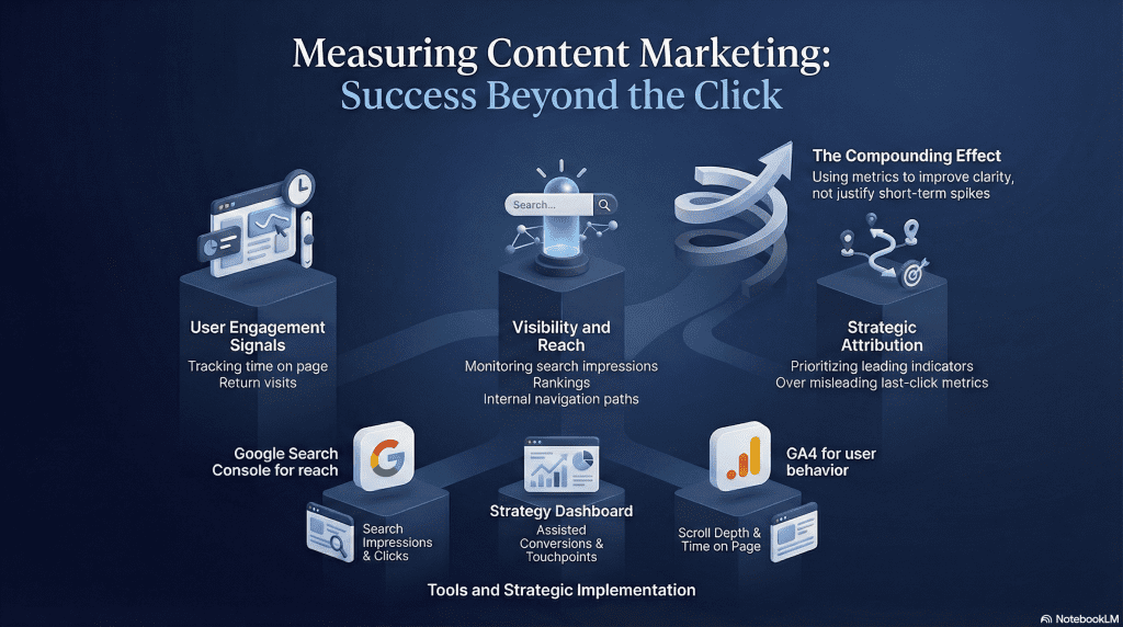 Attribution should be handled carefully. Content often supports decisions indirectly, influencing awareness or understanding before any measurable conversion occurs. Leading indicators, such as assisted conversions or content touchpoints, are usually more meaningful than last-click metrics alone.