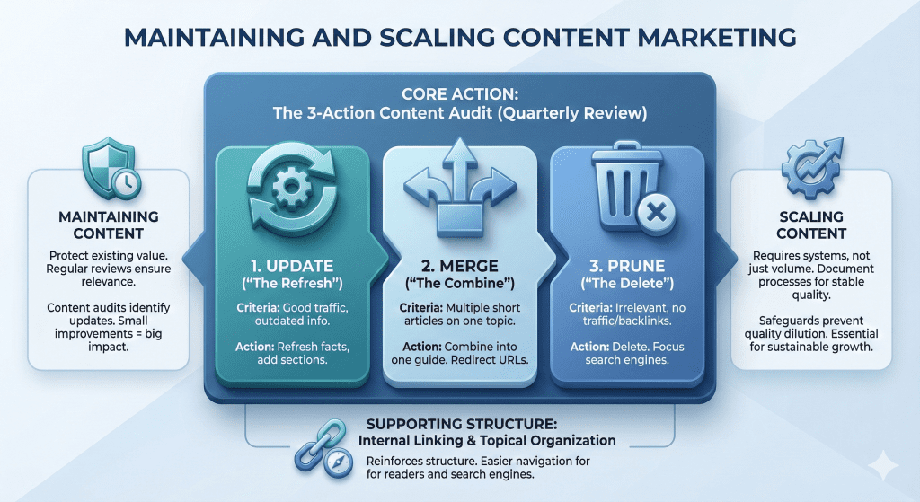 Maintaining content marketing is about protecting the value of what has already been created. Over time, content can become outdated, misaligned with audience needs, or disconnected from newer pieces. Regular reviews help ensure that core topics remain accurate, clear, and relevant.