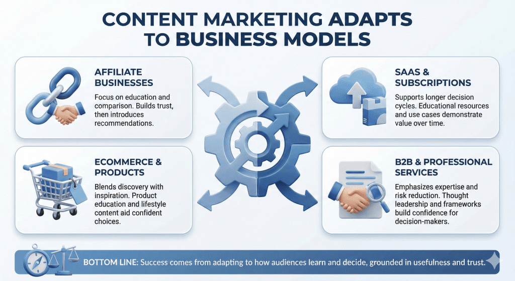 The principles of content marketing remain consistent, but how they are applied varies by business model. Audience needs, buying cycles, and success metrics shape how content is planned and evaluated.
