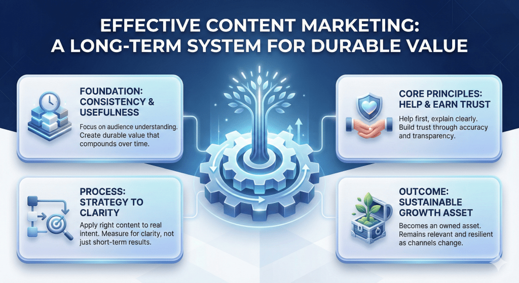 Content marketing is most effective when it is treated as a long-term system rather than a series of isolated tactics. By focusing on usefulness, consistency, and audience understanding, it creates durable value that compounds over time.