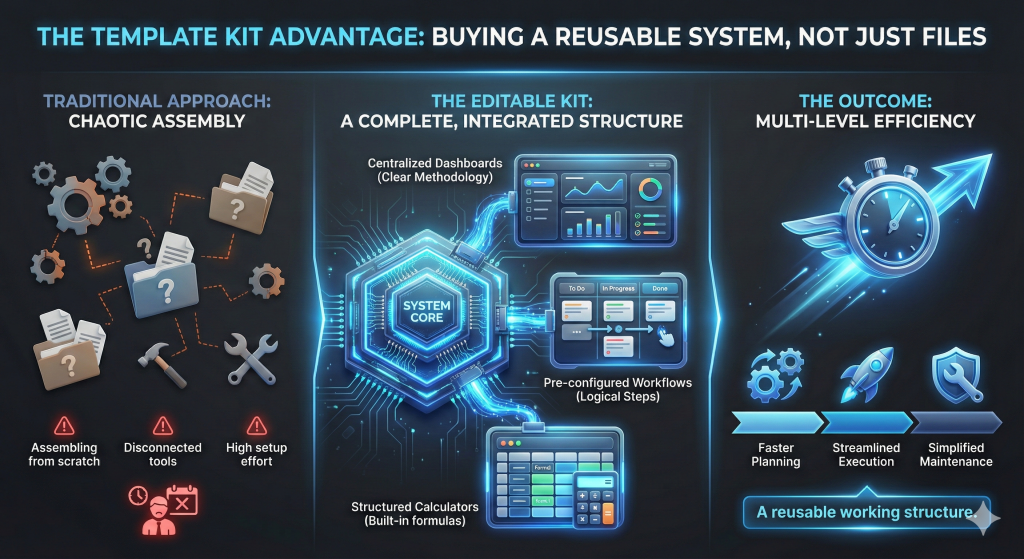 Editable template kits appeal to buyers who want an entire system, not individual pieces. Instead of assembling tools from scratch, users get a complete setup they can adapt to their own workflow. The value comes from integration, not just convenience.