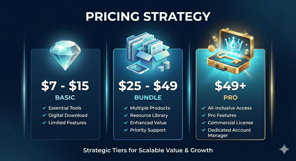 In 2026, most successful creators use tiered pricing to serve different levels of commitment. This allows beginners to enter easily while giving serious buyers a reason to spend more.