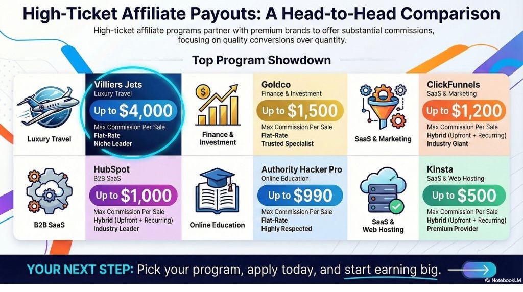 High-ticket affiliate programs are where serious affiliates find serious payouts. These programs partner you with premium brands from SaaS platforms to finance services to luxury travel companies and reward you with commissions that can start in the hundreds and often climb into the thousands.