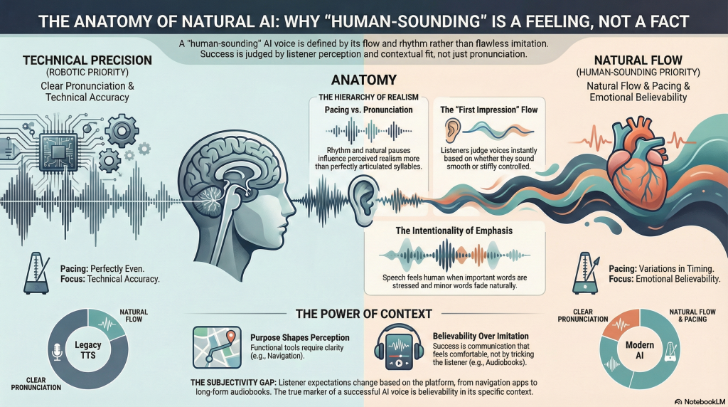 A human-sounding AI voice isn’t defined by perfection or by how closely it imitates a real person. It’s defined by how natural it feels to listen to whether the speech flows smoothly, pauses make sense, and emphasis supports meaning. These qualities shape perception far more than flawless pronunciation or technical precision.