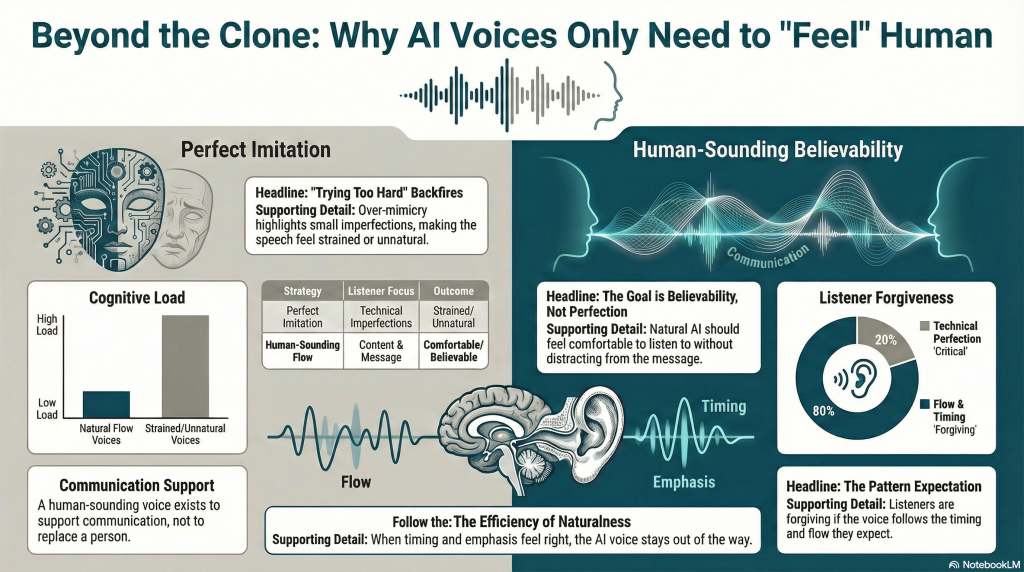 Trying to make an AI voice perfectly mimic a real person can sometimes have the opposite effect. Overemphasis on realism can highlight small imperfections and make speech feel unnatural or strained. In many situations, a voice that sounds clear, steady, and appropriately expressive feels more human than one that tries too hard to be indistinguishable.