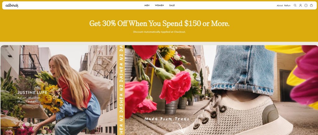Allbirds centers its landing pages on simplicity and sustainability. Messaging highlights comfort and eco-friendly materials in plain terms. Instead of overwhelming the visitor with options, the page guides them through a structured buying path.
