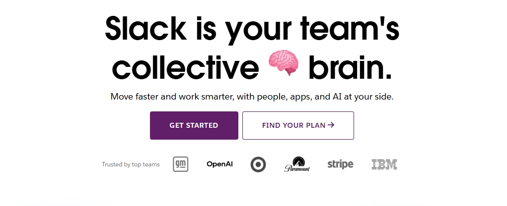 The landing page for Slack focuses immediately on outcome. The headline emphasizes simpler communication and improved teamwork rather than technical features. Supporting copy explains how teams stay aligned, while product visuals show the interface in context.