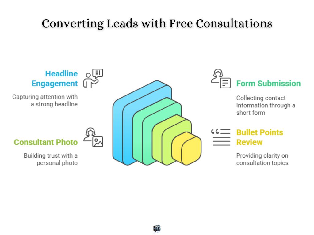 A consulting firm offers a “Free 30-Minute Consultation.” The landing page includes a strong headline, a short form, a photo of the consultant, and bullet points about what the call covers.