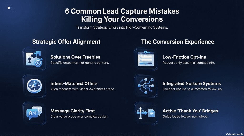 Bottom line: Most lead capture failures don’t come from poor tools or lack of traffic. They come from unclear offers, mismatched intent, and incomplete systems. Avoiding these mistakes doesn’t just improve conversion rates, it improves lead quality, engagement, and long-term results.