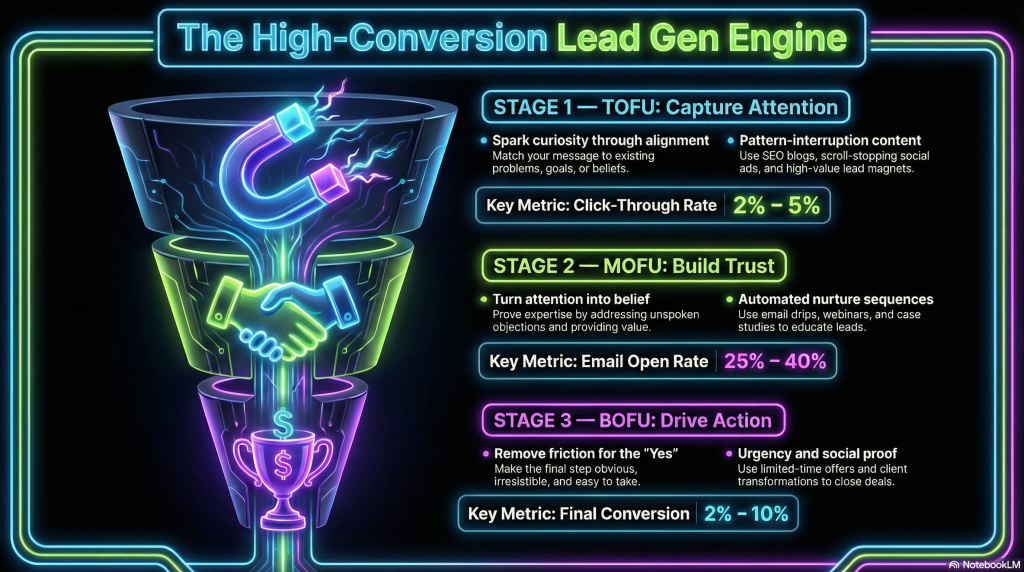 A true lead generation funnel meets your audience where they are addressing problems before pitching solutions. It guides prospects naturally toward a decision, not through pressure but through clarity and value.