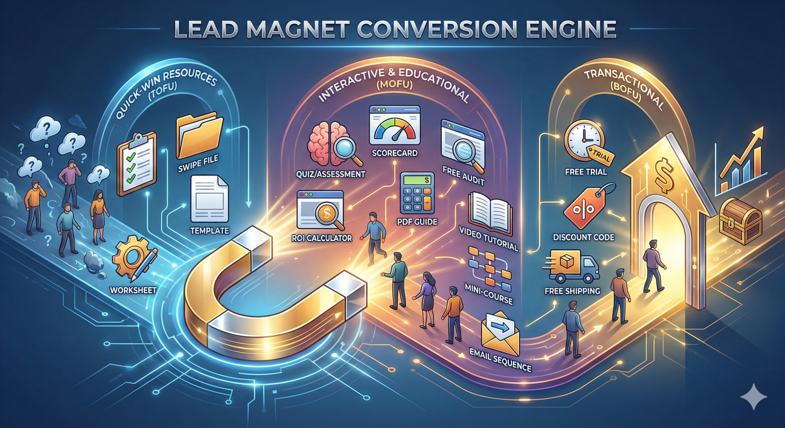 - 15+ proven lead magnet ideas organized by format and funnel stage.