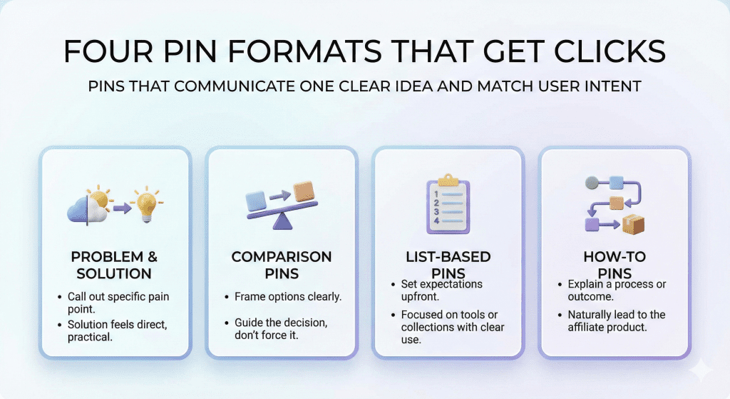 Pins perform well when they communicate one clear idea and match what the user is searching for. In affiliate marketing, a pin is a promise. The click happens only when that promise feels relevant and believable.
