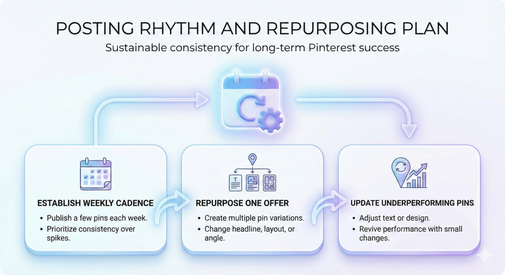 Pinterest rewards consistency more than volume spikes. A steady posting rhythm helps the platform understand your content and test it with the right audience.