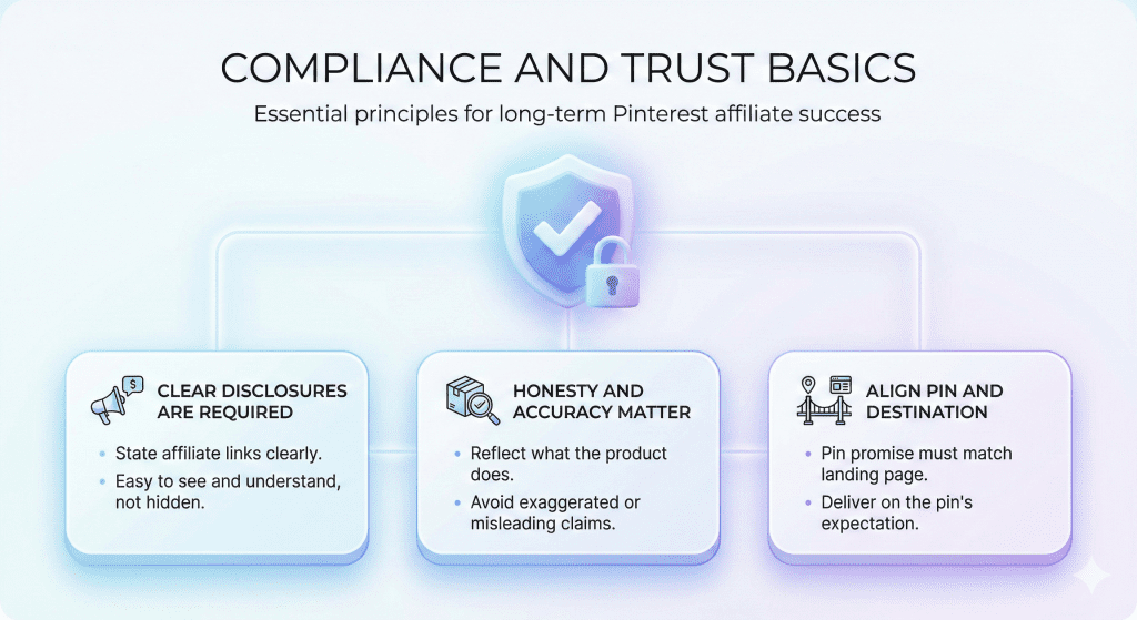 Affiliate marketing on Pinterest only works long term when trust and compliance are taken seriously. Clear communication protects your account and helps users feel confident about clicking.