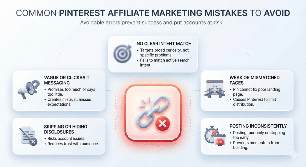 Most Pinterest affiliate issues come from avoidable mistakes, not bad luck or algorithm changes. Knowing what to avoid early saves time and protects your account.