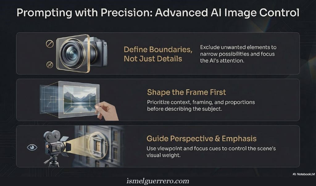 - Strong prompts function as creative briefs, defining subject, context, and visual intent.