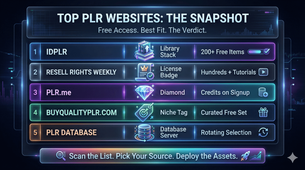 This snapshot compares leading PLR sources side-by-side. It highlights free access, best-fit users, and a one-line verdict so the detailed reviews that follow can focus on depth, caveats, and use cases.