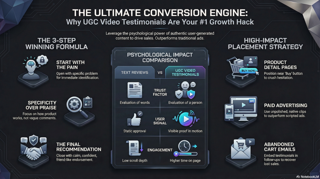 A strong UGC video testimonial follows a simple path: problem, discovery, experience, result, recommendation. When placed near decision points, it reduces friction and increases confidence.