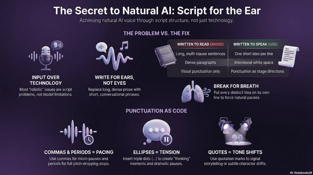 AI models treat punctuation as “stage directions” for breathing and timing. Use them intentionally: