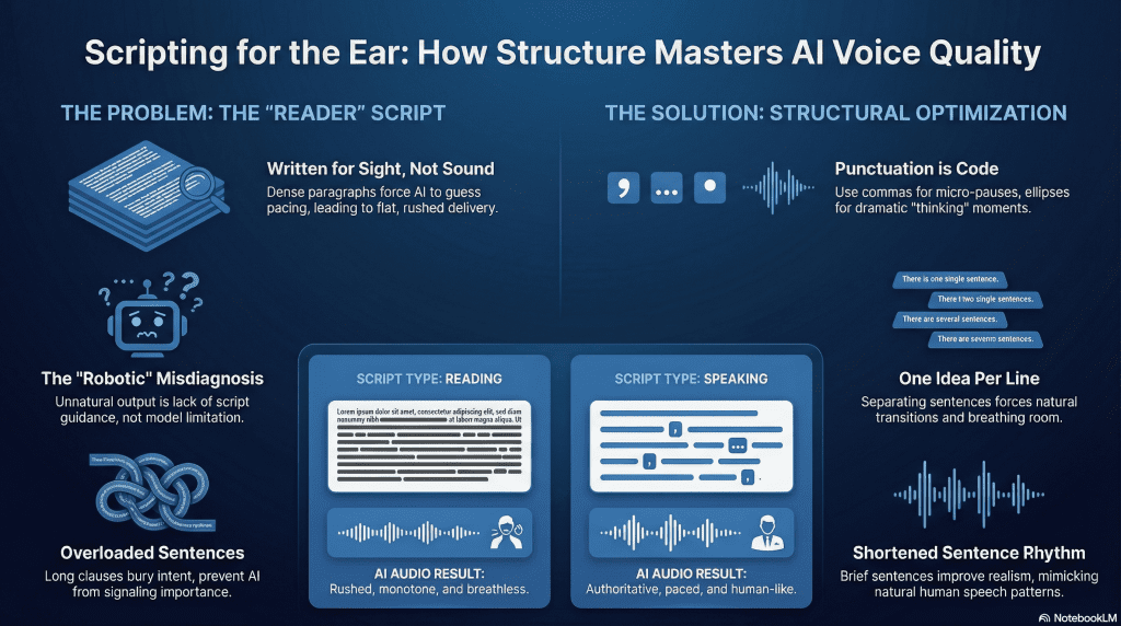 Written text often relies on punctuation and visual spacing to guide understanding. Spoken audio relies on rhythm and breath. Scripts that ignore this difference force the AI to guess where pauses belong, which leads to awkward pacing or unnatural stress on words that do not deserve it.