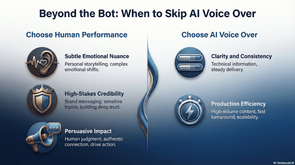 AI voice over is not always the best option, even when the script is well written. Content that depends on subtle emotional shifts, personal storytelling, or persuasion often requires human judgment in delivery. In these cases, the limitations are not technical, they are expressive.
