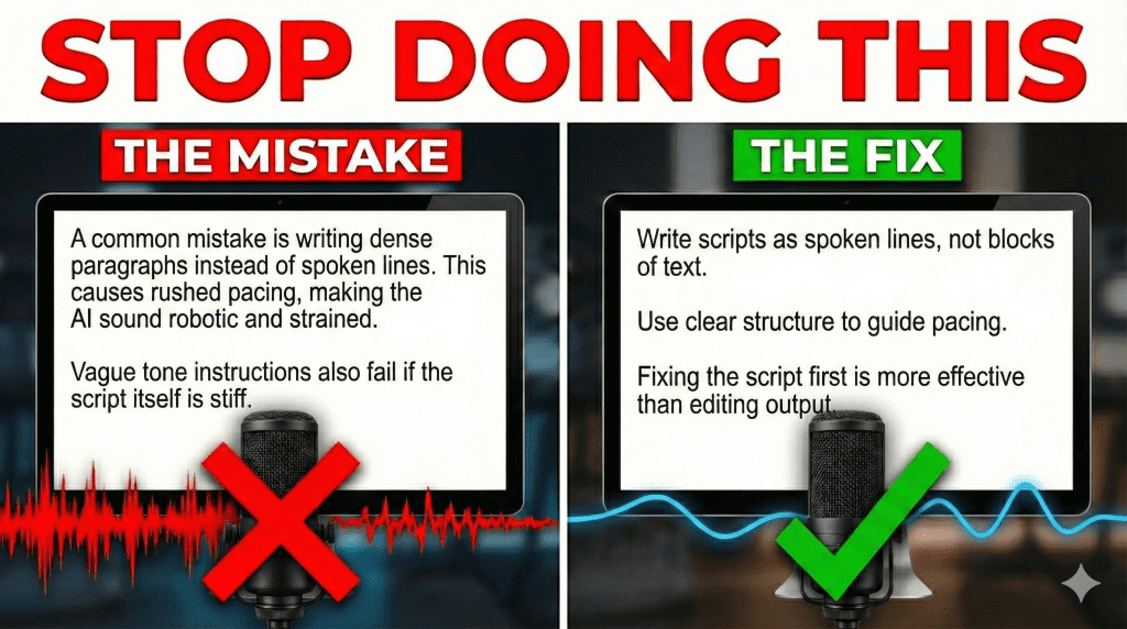 One common mistake is writing scripts as dense paragraphs instead of spoken lines. When too much information is packed into a single block of text, the AI delivers it without natural pauses. This causes rushed pacing and makes even a high-quality voice sound strained.