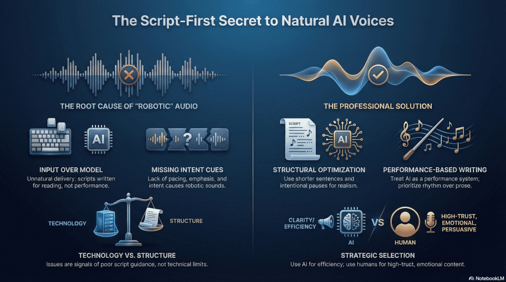 These issues are easy to misdiagnose as limitations of the voice model. In practice, they are signals that the script did not give the AI enough guidance. When intent, rhythm, and structure are unclear in the text, the audio makes that absence obvious to the listener.