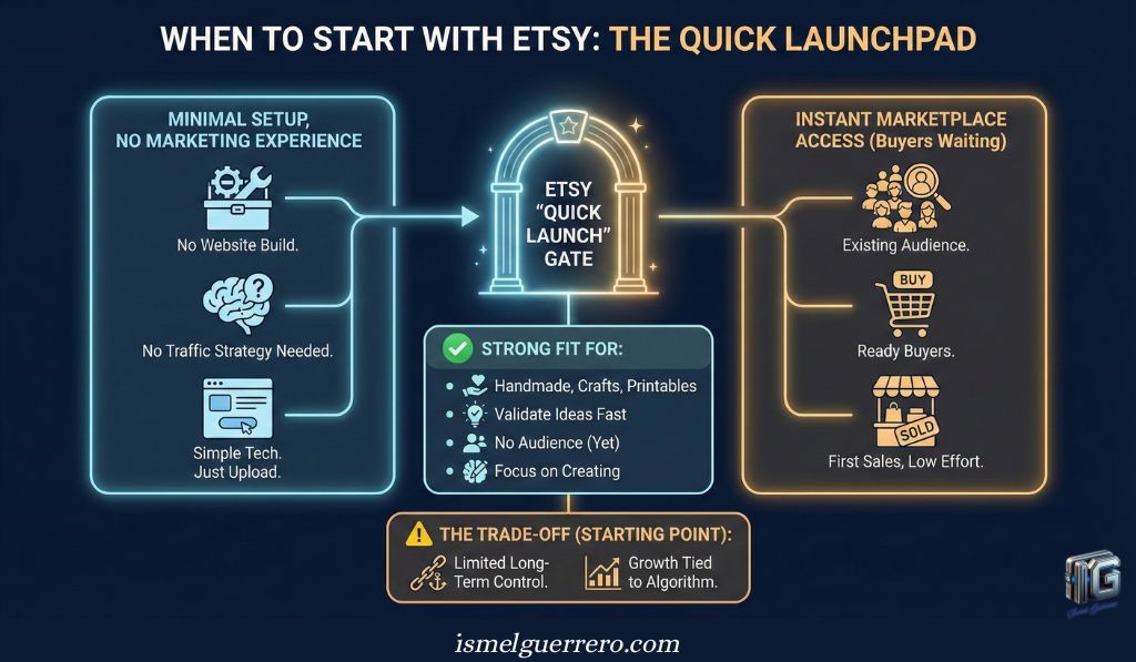 • Etsy reduces friction at the start by providing built-in traffic, but limits branding, pricing flexibility, and access to customer data.